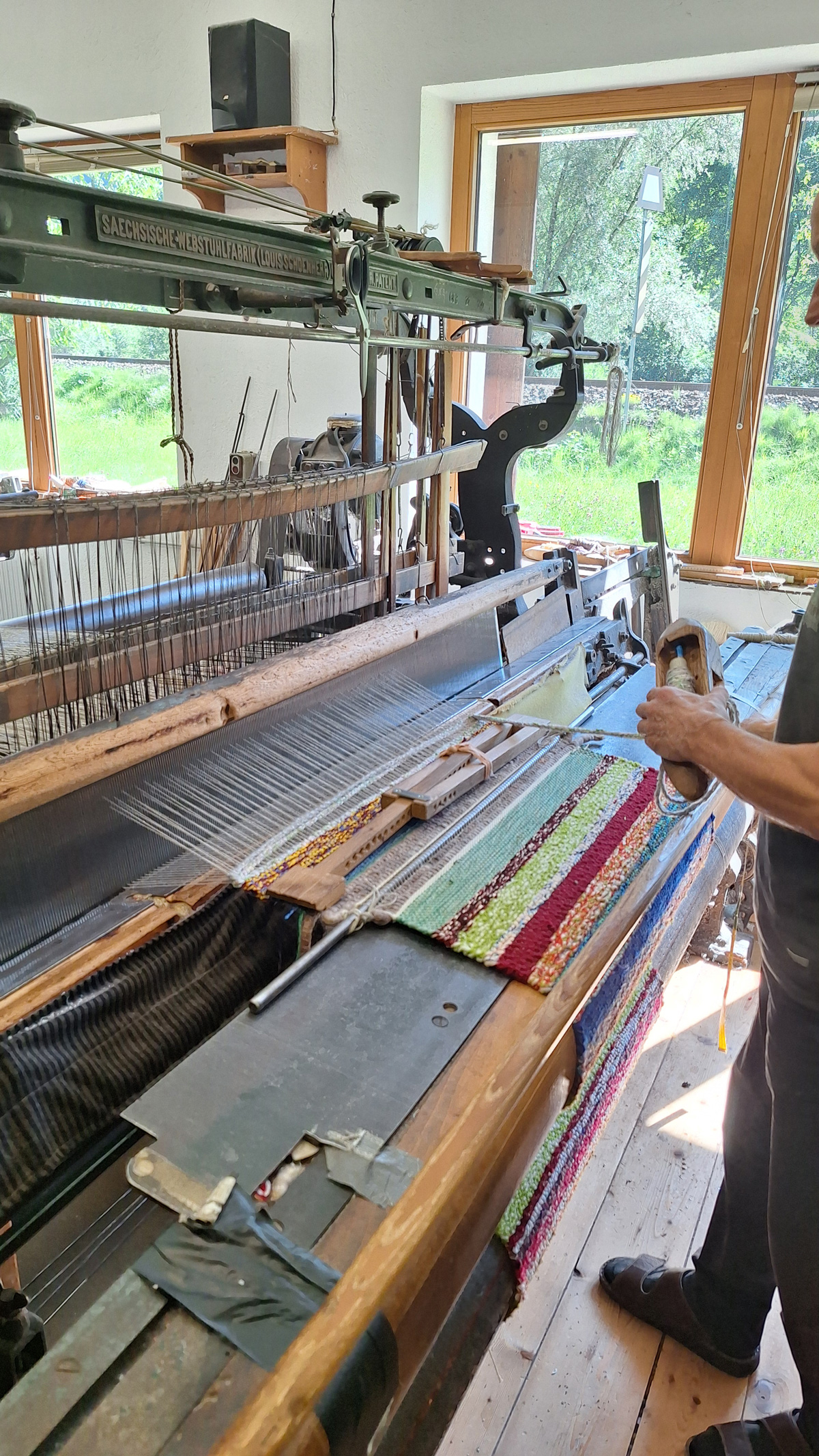Der Großvater von Josef hat sich nach dem Besuch der Webschule in Imst mit einer Weberei selbstständig gemacht. Anfang des 20. Jahrhunderts war er damit keinesfalls alleine. Die Schule war gut besucht, der Beruf sehr geschätzt und die Produkte nützlich und willkommen. „Zur damaligen Zeit war das ein ständiges Geben und Nehmen. Es wurde in erster Linie Lohnarbeit gemacht, das bedeutet, die Bäuerinnen und Bauern kamen mit der Rohware in der Hand zu uns und wir haben sie verarbeitet. Vor allem ging es dabei um Leinenstoffe, die aus altem Gewand oder zerschlissener Bettwäsche gewonnen wurden oder auch um Falchs, das von den Bauersleuten angebaut wurde, um daraus weben zu können“, erinnert sich Josef an die Erzählungen seines Vaters über die Anfänge der Weberei. Schon in sehr jungen Jahren hat dieser den Betrieb von Josefs Großvater übernommen und mit der gleichen Leidenschaft und Hingabe weitergeführt. Die großen Webstühle, die heute noch in der Werkstatt der Weberei im Einsatz sind, stammen aus diesen frühen 1920er Jahren und erledigen nach wie vor einen guten Dienst, wie uns Josef auch direkt zeigt. Er selbst arbeitet bereits seit den 1980er Jahren im Familienunternehmen, 1992 hat er es dann übernommen. „Leider konnte ich die Webschule schon nicht mehr besuchen und keine entsprechende Ausbildung machen. Die Schule hatte zu damals bereits geschlossen. Aber mein Vater hat mir alles gelernt, was ich für das Handwerk wissen musste, und ich habe eine Lehre als Verkäufer abgeschlossen“, erzählt der Weber, der in seiner Freizeit gerne sportelt und oft auf dem Mountainbike im Zillertal anzutreffen ist, wo er die Ruhe genießt, denn eines möchte man gar nicht glauben: